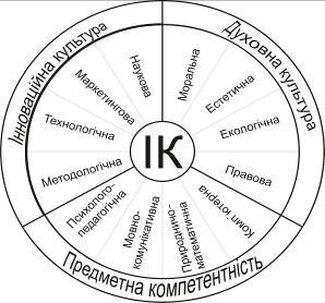 Враховуючи різні підходи дослідників до визначення поняття ІК та її місця в професійній культурі вчителя, пропонуємо своє бачення цієї структури (рис.2). ІК зображена в центрі схеми, оскільки вона є „джерелом живлення” всіх інших структурних компонентів професійної культури вчителя. Вплив ІК на кожну із підсистем професійної культури майбутнього вчителя можна довести. Наприклад, пошук наукової інформації, ознайомлення з науковими методами її обробки, збирання, дослідження, аналіз і зіставлення певних фактів, понять, явищ розвивають наукову культуру студента. Систематичне застосування ІТКТ для пошуку, відбору, інтегрування, структурування і створення власної інформації розвивають предметну компетентність, технологічну й методологічну культуру майбутнього вчителя.