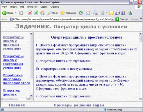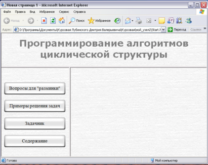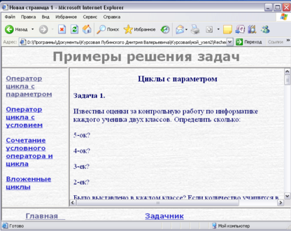 В цьому розділі учням пропонується самостійно (або за допомогою викладача) розглянути матеріал по даних темах. Вбудовані засоби навігації дозволяють вільно переміщатися за всім матеріалом. На малюнку 3 представлена основна сторінка з вже вирішеними прикладами задач.