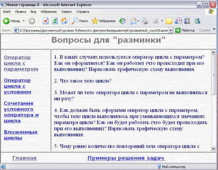 Короткий опис: мій фрагмент навчального посібника складається з 60 HTML - сторінок, перехід між якими здійснюється за допомогою гіперпосилань. На кожній web - сторінці міститься «Швидкий перехід», що дозволяє перейти на головну сторінку або на будь-яку необхідну web-сторінку, що спрощує пошук необхідної інформації. На малюнку 2 представлена основна сторінка питань для «розминки».