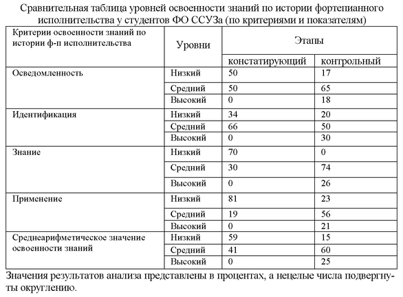 На контрольном этапе опытно-поисковой работы была произведена диагностика с использованием диагностического инструментария констатирующего этапа – тестов, анкет с незаконченными предложениями, письменных работ. Применение освоенных знаний в практической деятельности оценивалось по результатам студенческой концертной практики и при помощи самостоятельных письменных работ, содержащих исполнительский анализ изучаемых произведений. В группе студентов фортепианного отделения 2003 г. 21% достигли высокого уровня, 64% – среднего, 15% остались на низком уровне. В 2005 г. 20% респондентов имели высокий уровень, 68% – средний, 12% остались на низком уровне. В 2007 г. высокий уровень определен у 23% учащихся, средним признан 63%, низким – 14%. В 2009 г. достигли высокого уровня 30%, среднего – 58%, 12% остались на низком. При сравнении результатов констатирующего и итогового этапов у студентов всех лет обучения была выявлена положительная динамика в уровнях освоенности ими содержания дисциплины «История фортепианного исполнительства» и умении применять эти знания на практике, что и позволило составить следующую сводную таблицу: