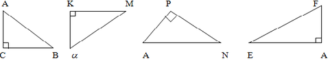, как отношение сторон этого треугольника. Предварительно учащиеся должны усвоить названия сторон прямоугольного треугольника: катеты (стороны прямого угла) и гипотенуза (сторона противолежащая прямому углу). Для этого необходимо предложить учащимся прямоугольные треугольники, разнообразные по расположению вершин прямого угла и предложить назвать стороны треугольника.