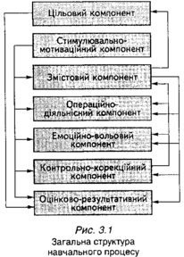 Навчальний процес як організаційна форма існування суспільних явищ має власну структуру й складається з таких компонентів: цільового, стімулювально-мотиваційного, змістового, операційно-діяльнісного, емоційно-вольового, контрольно-корекційного та оцінково-результативного (рис. 1).