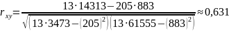Коэффициент корреляции Пирсона вычисляется по формуле: