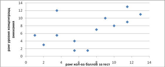 Перед подсчетом коэффициента корреляции убедимся, что между уровнем концентрации внимания учащихся и их учебными достижениями по математике существует определенная связь. Для этого по рангам, полученным учениками, построим диаграмму рассеивания.
