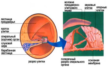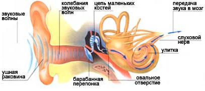 На волокнах слухового нерва, идущих вдоль основной мембраны, расположены волосковые клетки, являющиеся настоящими слуховыми рецепторами. Звуковое ощущение вызывается колебанием. Когда ушная раковина собирает звуковые волны, они отражаются в ее складках, затем проникают в наружное слуховое отверстие и ударяются о барабанную перепонку. Эта перепонка начинает колебаться с определенной частотой и высотой. Цепь из косточек среднего уха усиливает это колебательное движение и передает его в овальное отверстие, уже во внутреннее ухо. Здесь механическая энергия звуковых волн превращается в электрическую энергию благодаря тому, что волокна слухового нерва возбуждают спиральный орган, расположенный в улитке, и передают слуховое ощущение в головной мозг.