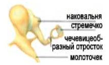 Среднее ухо представляет собой полость, расположенную внутри височной кости. Оно сообщается с носоглоткой с помощью слуховой (евстахиевой) трубы и имеет цепь сочлененных маленьких костей - молоточек, наковальню и стремечко, передающих точно и в усиленном виде колебания барабанной перепонки до тонкой овальной пластинки диаметром 1см во внутреннем ухе (Рис.2).