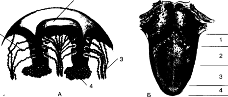 Рис. 7. А — строение вкусового сосочка: 1 — вкусовые рецепторы; 2 — вкусовой сосочек; 3 — вкусовые нервы; 4 — железы, секреты которых отмывают сосочек от воздействовавших на него веществ; Б — вкусовые зоны языка и ощущения, возникающие при их раздражении: 1 — горькое; 2 — кислое; 3 — сотеное; 4 — сладкое