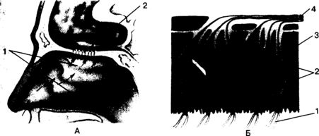 А — расположение органа обоняния в носовой полости: 1 — носовая полость; 2 — обонятельные рецепторы и отходящие от них в головной мозг чувствительные нервы; Б — клеточное строение обонятельных рецепторов: 1 — реснички; 2 — обонятельные клетки; 3 — эпителиальные клетки; 4 — нервные волокна