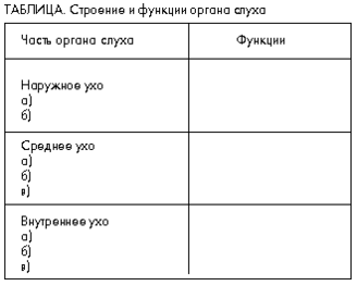 1. Строение органа слуха. (Лабораторная работа учащихся, самостоятельная работа с учебником: текстом, рисунками, моделями. Заполнение таблицы.)