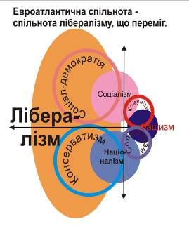 З іншого боку, до 70-х років у Європі остаточно перемогли і соціалізм, і націоналізм — у тому сенсі, що не залишилося ані пригноблених класів, ані пригноблених націй. Причому це стало можливим лише завдяки цілковитій перемозі лібералізму. [4]