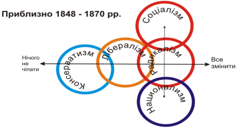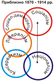 Виникає соціал-демократія як помірна форма соціалізму, що приймає основні цінності лібералізму. Водночас консерватизм, з одного боку, «лібералізується», а з іншого — набуває помірно націоналістичних рис 3.