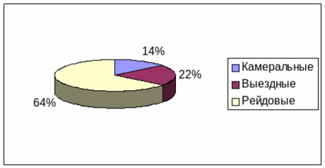 Как видно из диаграммы, на долю рейдовых мероприятий приходится свыше половины проверок. Это объясняется большим количеством налогоплательщиков-предпринимателей и иных физических лиц. Среди данной категории плательщиков наблюдается устойчиво низкая налоговая дисциплина, особенно в последнее время. Поэтому необходим весьма жесткий контроль за соблюдением ими законодательства о налогах и предпринимательстве. В этой связи, как показывает ситуация, достаточно эффективны рейдовые проверки. Такая результативность определяется прежде всего внезапностью.