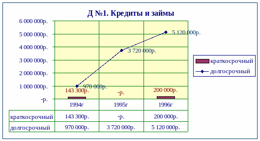 В Диаграмме №1 «Кредиты и займы» я привёл данные за три года. Причём я хотел бы сразу оговорить, что это суммарные цифры, т.е. показана общая сумма кредиты с динамикой роста. Исходя из диаграммы можно сказать, что на предприятии существует большая потребность в долгосрочном инвестиционном проекте большой стоимостью, финансирование которого происходило бы постоянно, но из-за невыгодности его воплощения в жизнь законным способом обе стороны – банк и предприятие – договорились о постоянном предоставлении долгосрочных кредитов на каких-либо формальных основаниях. Причём такая практика давно имеет место на большинстве российских предприятий.