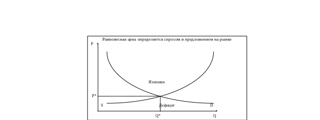 Пересечение кривых спроса и предложения определяет цену равновесия (или рыночную цену) и равновесное количество продукции. Любую другую цену конкуренция делает неустойчивой.
