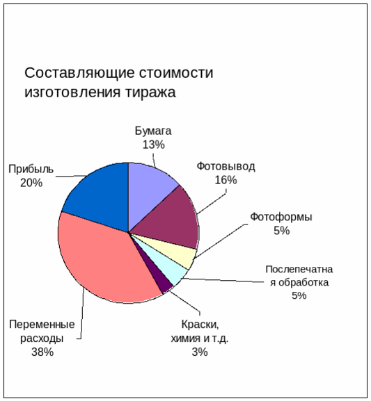 Себестоимость изготовление тиража, скажем полноцветных буклетов формата А 4, можно разбить на следующие статьи расходов: