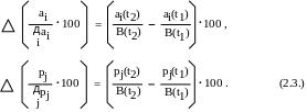 В графе 1 таблиц 2.3 и 2.4 указаны статьи и разделы актива и пассива баланса предприятия. Для того чтобы отразить главные, существенные черты финансового состояния, набор статей баланса может быть сильно агрегирован, вплоть до рассмотрения в первую очередь итогов разделов актива и пассива с выделением в некоторых разделах итогов больших групп однородных статей. Для описания алгоритма расчета сравнительного аналитического баланса используются следующие обозначения: ai(t1), ai(t2) - значения по i-й статье актива баланса предприятия на начало и конец отчетного периода; pj(t1), pj(t2) - аналогично для статей пассива баланса; B(t1), B(t2) - итог баланса предприятия. В качестве величин ai, pj могут выступать также итоги групп статей или разделов баланса.
