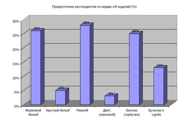 Что касается предпочтений покупателей по видам хлебобулочных изделий, то наибольшей популярностью пользуются: уральский подовый – 28%, формовой белый – 26%, батоны и горбулки – 25%, булочки и сдоба 13%, круглый белый – 5%, диетический зерновой – 3%.