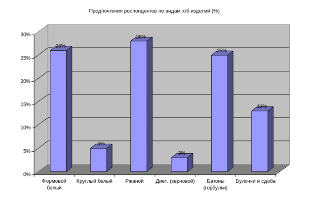 Что касается предпочтений покупателей по видам хлебобулочных изделий, то наибольшей популярностью пользуются: уральский подовый – 28%, формовой белый – 26%, батоны и горбулки – 25%, булочки и сдоба 13%, круглый белый – 5%, диетический зерновой – 3%.