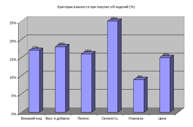 при покупке хлеба являются: свежесть (25%), вкус (18%), внешний вид (17%), полезность (16%), цена (15%), упаковка (9%) .