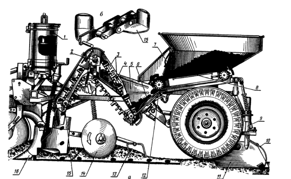 Рихлювач сліду коліс 10 (пружинна лапа з наральником) рихлить грунт, ущільнений колесом машини. При роботі на схилі до 5° стабілізатор 11 утримує машину від сповзання