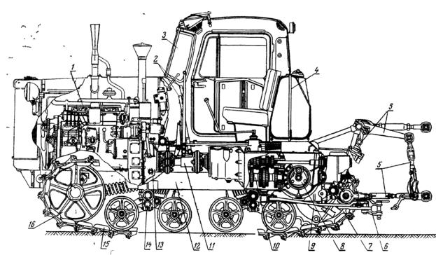 1—двигун, 2— важелі управління; 3—кабіна, 4—паливний бак, 5 — гідравлічна навісна система; би—причіпний пристрій; 7 — ведуче колесо (зірочка), 8 —планетарний механізм 9 — кінцева передача 10 — коробка передач, 11— з'єднувальний вал, 12 - рама; 13 — зчеплення; 14 - передня каретка підвіски з опорними катками, 15 — гусеничний ланцюг;