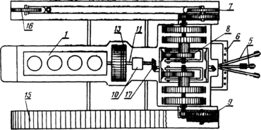 У двигуні 1 відбувається перетворення хімічної енергії згоряючого в його циліндрах палива в механічну енергію.