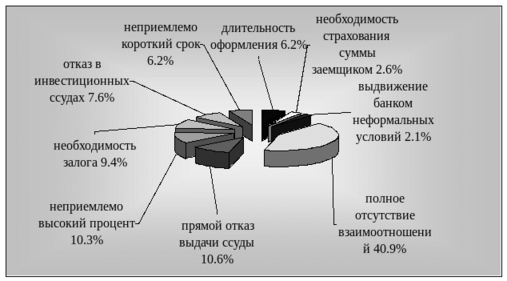 На диаграммах 1 и 2 продемонстрирована динамика числа малых предприятий России, воспользовавшихся ссудами банков в период 1995-1999 г.г., а также распределение факторов, определяющих отказ субъектов малого предпринимательства от получения кредитов. Диаграммы составлены на основе данных, полученных в результате опроса руководителей малых предприятий Российским независимым институтом социальных и национальных проблем. Эти графики иллюстрируют уже описанную ситуацию. С начала 90-х годов активность сотрудничества российских малых предприятий с отечественными и зарубежными кредитными институтами неуклонно падала. При этом в 1999 г. лишь 14,1 % малых предприятий смогло получить ссуды для финансирования капиталовложений, остальные 13,8 % использовали кредиты в целях восполнения недостатка собственных оборотных средств. В диаграмме 2 особенно обращает на себя внимание тот факт, что полное отсутствие «взаимоотношений» малого бизнеса с банками вряд ли возможно. Какой-то минимум сотрудничества банков и организаций существует всегда, хотя бы на уровне обслуживания расчетных счетов. Следовательно этот фактор следует понимать скорее как невозможность получения от партнерского банка не только кредитных, но и любых других услуг.1