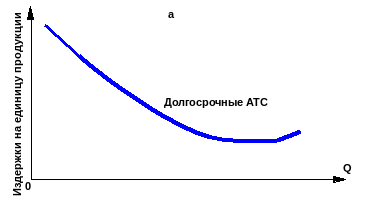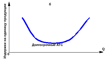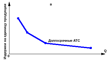 Из рис. 12, в видно, что кривая долгосрочных ATC сначала стремительно падает, затем темп падения замедляется и она плавно снижается с увеличением объёма выпуска. Средние издержки приближаются к постоянным. Такие кривые называются ещё L-образными кривыми.