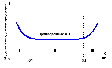 Почему так происходит? Почему кривая долгосрочных ATC имеет дугообразную форму? Законом убывающей отдачи это явление объяснить нельзя, ибо условием его действия является постоянство хотя бы одного из применяемых производственных факторов. Нам же известно, что в долгосрочном периоде изменяться могут все факторы. Динамику кривой долгосрочных средних общих издержек можно объяснить при помощи так называемого эффекта масштаба.