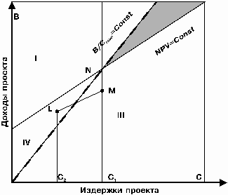 Если оцениваются проекты в условиях строгого бюджетного ограничения С=С*, то не возникает никаких проблем. Границы эффективности совпадают для обоих критериев (NPV = 0 B/Cratio = 1). Проекты лежащие выше на вертикальной линии имеют большую доходность; М предпочитается L и уступает N,