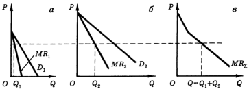 Следовательно, кривая предельной выручки монополиста представляет собой горизонтальную сумму кривых предельной выручки обоих секторов рынка (рис. 2,в). Заметим, ход приведенных выше рассуждений полностью аналогичен ходу рассуждений, с помощью которых мы показали, что монополист, осуществляющий выпуск продукции на нескольких заводах, всегда распределяет свой объем производства между этими заводами так, что предельные затраты по выпуску продукции на всех заводах равны между собой.