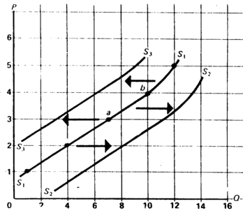 Различие между изменением в предложении и изменением величины предложения такое же, как различие между изменением в спросе и изменением величины спроса. Изменение в предложении выражается в смещении всей кривой предложения. Увеличение предложения смещает кривую вправо, уменьшение предложения смещает ее влево. Причиной изменения предложения служит изменение одной или более детерминант предложения. Экономисты используют понятие "предложение" для обозначения шкалы или кривой. Поэтому изменение в предложении должно означать, что вся шкала изменилась и что кривая сместилась в какую-то сторону. Напротив, изменение величины предложения означает передвижение с одной точки на другую точку на постоянной кривой предложения. Причиной такого передвижения является изменение цены на рассматриваемый продукт.