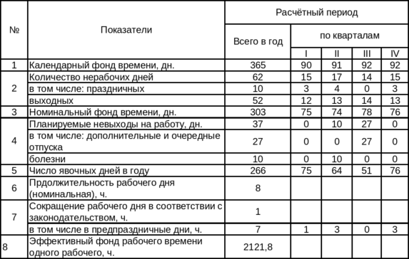 Расчёт баланса рабочего времени одного среднесписочного рабочего.