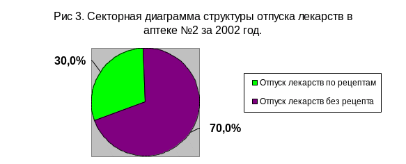 Как видно на рисунке, 70,0% в данной аптеке составляет безрецептурный отпуск лекарств и лишь 30,0% - отпуск лекарств по рецептам.
