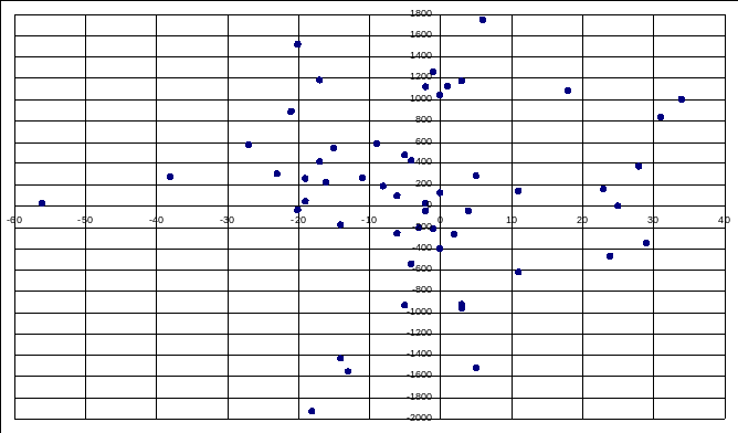 По собранным статистическим данным АК "Домостроитель" (по подразделениям СМУ-21, ЖБК-2) за последние 4-5 лет (приложение 6) зависимости объема работ от численности и объема работ от выработки можно представить в виде точек на графике (рисунок 8 и 9).