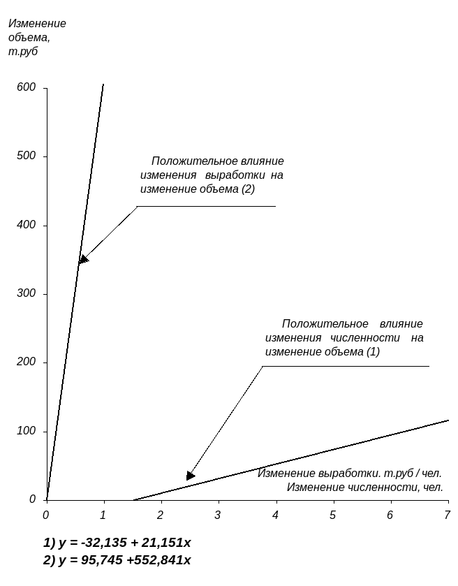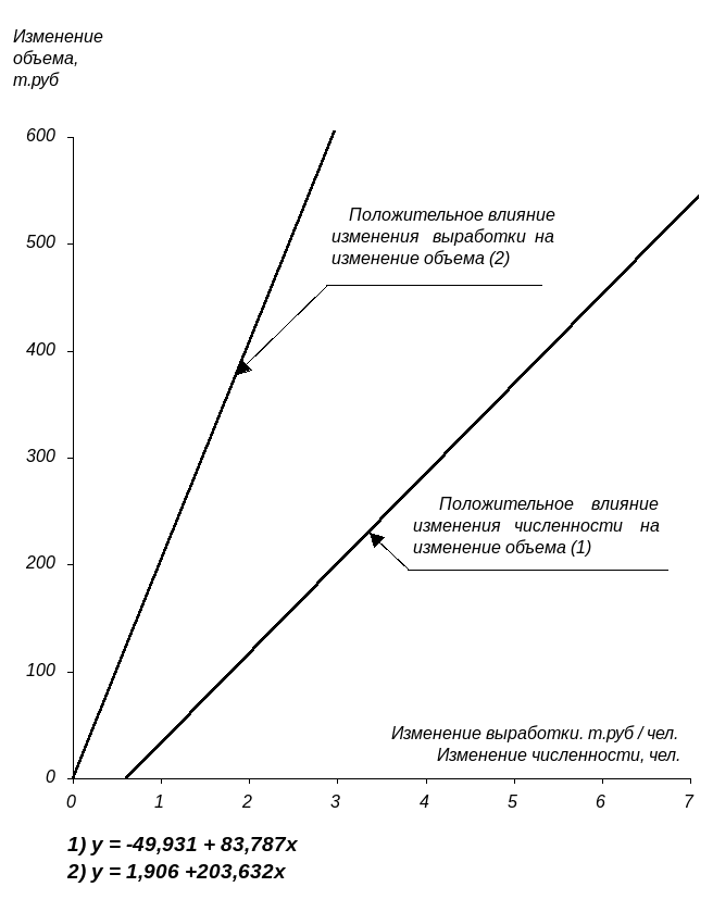 | Изменение выработки 1 рабочего, | Изменение объема выполнения работ, |
