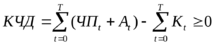 Кумулятивный чистый доход (КЧД) в виде накопительной суммы чистой прибыли (ЧПt) и амортизационных отчислений (Аt) за вычетом общих инвестиционных затрат (Kt) должен быть больше или равен нулю.