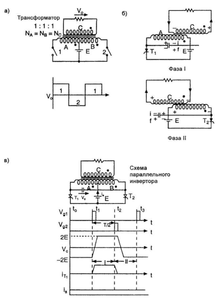Электрическая схема, рабочие фазы и формы выходных сигналов параллельного инвертора изображены на рис.2. Параллельные инверторы применяются в низкочастотных устройствах. В них используются трансформатор с отводом из центра первичной обмотки, два тиристора и коммутирующий конденсатор. Источник питания включается между центральным выводом и общей точкой катодов тиристоров. Эквивалентное нагрузочное сопротивление, пересчитанное в цепь первичной обмотки, подключено параллельно коммутационному конденсатору. Следовательно, инвертор такого типа является параллельным.