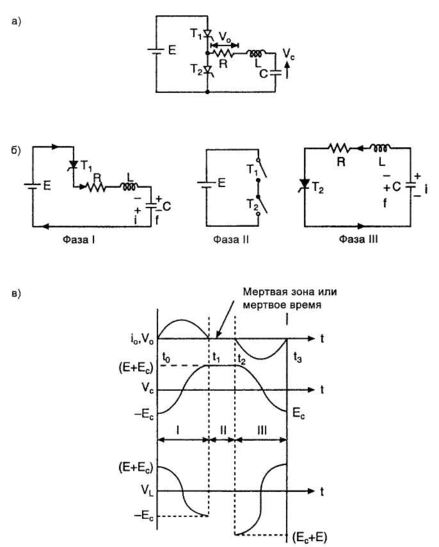 Фаза I. Тиристор Т1 включается в момент времени to. Начинается заряд конденсатора от источника питания. Последовательная цепь R, L и С формирует синусоидальный ток через нагрузочное сопротивление и выполняет функцию демпфирующей цепи. Когда ток в цепи уменьшается до нуля, тиристор Т1 запирается. Напряжение на нагрузочном сопротивлении находится в фазе с током тиристора. Формы напряжений VL и Vc можно получить с помощью теоремы Кирхгофа: (VL+ Vc = E), величины VL и Vc должны удовлетворять условиям этого уравнения.