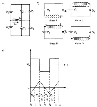 Принцип действия схемы можно объяснить, рассмотрев четыре фазы ее работы. Диоды Dx и D2называются возвратными диодами. Инвертор не может управлять индуктивной нагрузкой без возвратных диодов. Без диодов в схеме имеются большие выбросы напряжения при переключении тиристоров, поскольку нагрузка индуктивная. Эти выбросы напряжения могут разрушить тиристоры. Электрическая схема, рабочие фазы и форма выходного сигнала однофазного полумостового инвертора с индуктивной нагрузкой изображены на рис.4.