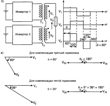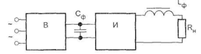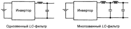 азличные типы используемых фильтров изображены на рис.13г. В однозвенном LС-фильтре реактивное сопротивление индуктивности L с увеличением частоты увеличивается, то есть высокочастотные компоненты на выходе существенно ослабляются. С увеличением индуктивности L увеличиваются омические потери в фильтре. Конденсатор С обладает высоким реактивным сопротивлением на низких частотах, но при этом эффективно шунтирует высокочастотные компоненты. Оптимальный выбор элементов фильтра позволяет увеличить рабочий ток инвертора без существенного увеличения потерь в LC-фильтре