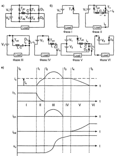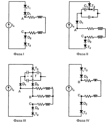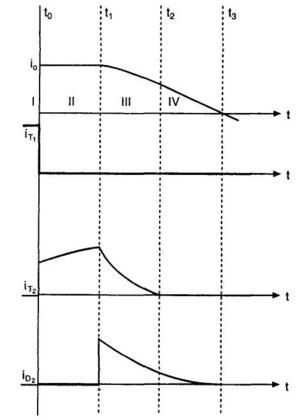 Фаза III. Пока диод D2 проводит ток, тиристор Т2 не может находиться в состоянии проводимости, поскольку он смещен в обратном направлении. Как только диод D2 запирается, можно включить тиристор Т2. На промежутке времени t2 - t3 напряжение и ток отрицательные, а мощность - положительная, то есть мощность передается от источника питания к нагрузке. В момент времени t= t4 тиристор Т2 принудительно включается.