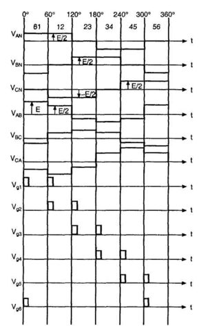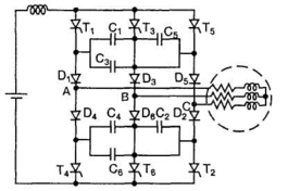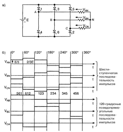 лектрическая схема и рабочие фазы трехфазного инвертора тока изображены на рис.10. Этот тип инвертора называется инвертором К. Филипса. Его работа основана на коммутировании напряжения. Большая индуктивность, включенная последовательно с источником напряжения, работает как источник тока. Схема работает в 120-градусном режиме.