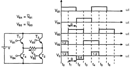 промежутке времени от t0 до t1 в проводящем состоянии находятся транзисторы Т1 и Т1. В это время на нагрузке положительное напряжение. В промежутке времени от t2 до t3 проводящем состоянии находятся транзисторы Т3 и Т4, на нагрузке при этом отрицательное напряжение. Выходным напряжением инвертора можно управлять, изменяя угол 9. Чем больше значение 9, тем меньше выходное напряжение инвертора, и наоборот. Недостатком этого способа регулирования является присутствие в выходном напряжении большого количества высших гармоник.