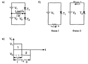 Электрическая схема, рабочие фазы и форма выходного сигнала однофазного полумостового инвертора с резистивной нагрузкой изображены на рис.3. Тиристор Т1 находится в проводящем состоянии в течение периода Т0/2 (Г0 = 1//о). Тиристор Т2 включается в момент времени Т0/2 и инициирует отрицательный полупериод тока нагрузки, за счет чего тиристор Т1, выключается. В момент времени То снова включается тиристор T1 а тиристор Т2 выключается. Этот процесс повторяется, тем самым обеспечивается непрерывное прямоугольное напряжение на нагрузке. Это возможно, так как тиристоры T1 и Т2 одновременно не запускаются.