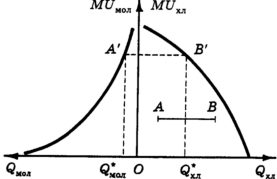 В первом квадранте изображен график предельной полезности хлеба, во втором - молока. При этом единицы измерения натуральных количеств обоих продуктов выбраны таким образом, чтобы в единицу времени можно было потребить либо единицу хлеба, либо единицу молока. Отрезок АВ представляет количество времени, которым располагает субъект для потребления выбранных продуктов питания. Чтобы определить равновесную структуру потребления, потребителю достаточно поднять «планку» АВ (сохраняя ее горизонтальное положение) до «упора», чтобы она заняла положение A`B`. Проекции точек «упора» на ось абсцисс укажут искомый набор потребляемых благ: Qхл*, Qмол*.