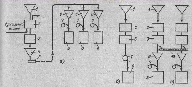 В схеме центральной системы пылеприготовления (рис. 2, а) после предварительной подготовки топливо из бункера сырого угля 1 поступает в сушилку 2, далее в мельницу 3, а затем в центральный бункер готовой пыли 4. Пылевым насосом пыль 5 подается в расходные пылевые бункера 6 парогенераторов. Из бункеров 6 пыль поступает в топочную камеру 8, куда так же подается воздух вентилятором 7.