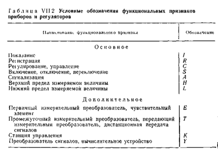 Условные обозначения измеряемых и регулируемых величин, используемые при обоих способах построения, приведены в табл. VII.1, а обозначения функциональных признаков приборов и регуляторов — в табл. VII.1.