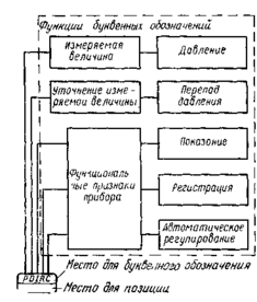 Буквенные обозначения располагают в определенном порядке слева направо. Сначала дают обозначение основной измеряемой или регулируемой величины, затем, в случае необходимости — обозначение ее уточняющее и далее — обозначение функциональных признаков прибора., Последние также располагают в следующем порядке: IRCSA.