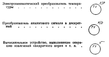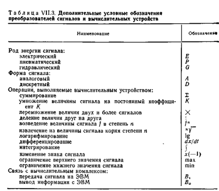 При развернутом способе построения средств автоматизации используют также дополнительные условные обозначения, отражающие функциональные признаки приборов и применяемые для построения, преобразователей сигналов и вычислительных устройств (табл. VII.3).